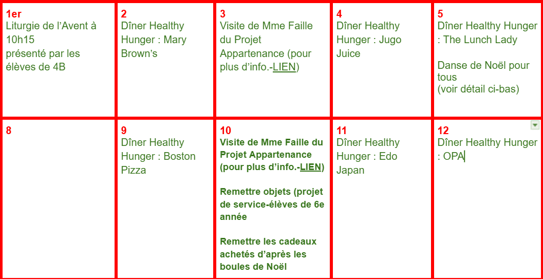 Merci à tous ceux qui participent à la campagne “Une boule de Noël pour le bonheur d’un enfant” cette année. qui se tiendra lors des rencontres de parents ainsi que le 5 décembre lors de la danse de Noël. Comme vous le savez, si vous avez pris une boule de Noël, il suffit de parrainer un enfant en lui achetant un cadeau d’une valeur d’environ 30 à 40$.